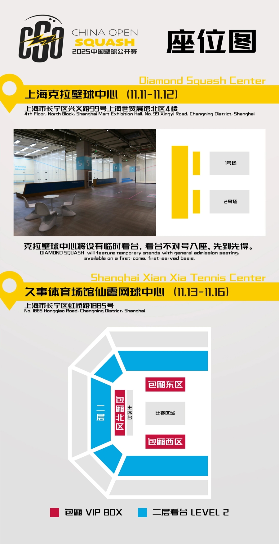 作为申城一年一度的壁球嘉年华,今年的比赛在延续高规格办赛水准的同时,尝试以更丰富多元的票务产品来带动观赛热潮。前两轮比赛实行日、夜场分场售票,票价设置更为亲民,最低120元即可满足不同人群的观赛需求;11月13日至16日则为单日通票,开设包厢区域及二层看台供球迷选择。除此之外,赛事首次推出含有球员见面互动权益的包厢北区两日套票和全程套票两款产品,让观众能够一票在手尽享体坛盛宴。而在购票同时,观众还可使用“乐动上海”体育消费券(观赛类)进行抵扣,更添一份便利。